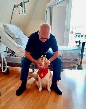 Die stellvertretende Pflegedienstleitung des Krankenhauses hatte das Besuchsteam vor dem Empfang im EG begrüßt und zur Station begleitet. Nach dieser ersten Erfahrung hat sie ihr Okay gegeben, dass Lou in der Folgewoche nochmals zu Besuch kommen durfte. Der Kontakt kam über den Malteser-Hospizdienst sinnan zustande, da geschulte Sterbebegleiter:innen dieses Dienstes im Rahmen einer Kooperationsvereinbarung auch die Patient:innen der Palliativstation betreuen. Der erste Besuch des Mensch-Hund-Teams wurde auch von einer erfahrenen und dem Patient bekannten Sterbebegleiterin unterstützt. Wir gehen davon aus, dass es nun hin und wieder auch vierbeinigen Besuch auf dieser Station geben wird und freuen uns sehr darüber!