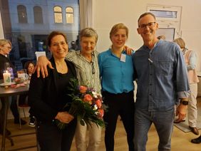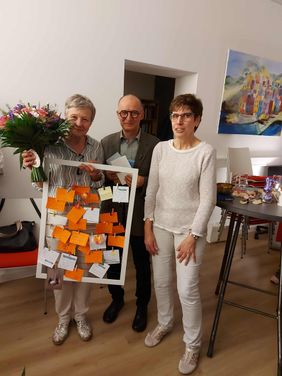 Andrea Ferger-Heiter, Stadtgeschäftsführerin der Malteser in Köln für den Bereich ‚Soziales Ehrenamt‘, begrüßte alle Anwesenden herzlich und dankte Monika Schwertner u.a. mit einem Blumenstrauß von den Kolleg:innen der Stadtgeschäftsstelle sehr für ihr großes Engagement in der Weiterentwicklung des Dienstes. Monika Schwertner selbst schilderte die drei Jahre als sehr intensive Zeit und lobte besonders die gute vertrauensvolle Zusammenarbeit im Team der drei Koordinatorinnen und der zahlreichen ehrenamtlich Tätigen. Daran schlossen die drei Ehrenamtlichen Gabriele Schmitz-Dahm, Christel Padberg und Michael Heinrichsdorff mit einem großen DANKE SCHÖN für die sehr wertschätzende Unterstützung an und überreichten einen Bilderrahmen mit vielen individuellen Wünschen. Zum guten Schluss fand Mit-Koordinatorin Melanie Hofer noch ebenso lobende und dankende Worte für die große gegenseitige Verlässlichkeit in der Zusammenarbeit. Die eine oder andere Träne war nicht zu unterdrücken, aber insgesamt gönnen alle Anwesenden Monika Schwertner von Herzen diesen Schritt raus aus der ihr Leben prägenden Sozialarbeit in vielen Facetten hin zu den privaten Themen ‚Kunst und Kultur‘, die nun mehr Raum einnehmen sollen.