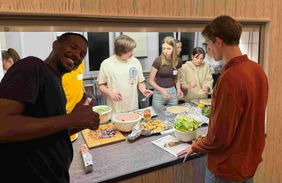 Für den ersten Termin hatten die Ehrenamtler Omer, Ahmed, Katharina, Lotti und Elsa eingekauft. Mittwochabend haben sie dann zusammen mit Geflüchteten aus der Ukraine und Afghanistan fleißig Zutaten gewaschen und geschnippelt … bis die Halloumi-Hummus-Wraps gelungen und fertig waren. Anschließend durften alle die eigene Herstellung probieren … und zum Schluss musste die Küche wieder saubergemacht werden.