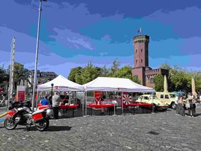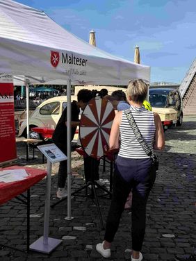 Die Malteser Köln waren primär vertreten durch die vielfältigen Dienste im Bereich Soziales Ehrenamt, ergänzt vom Schulbegleitdienst, einem Motorrad der Krad-Staffel der Einsatzdienste sowie zwei Oldtimer-Fahrzeugen in Elfenbein-Lackierung. Als Mitmach-Aktionen am Stand konnten interessierte Bürger die Herz-Druckmassage an speziellen Puppen üben sowie am Glücksrad drehen und einen der zahlreichen Preise für Kinder oder Erwachsene gewinnen.