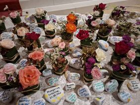 Ingrid Schreiber hatte dafür wunderschöne Blumen-Sushis gestaltet und Michael Heinrichsdorff seine inspirierenden Engel-Kunstwerke zur Verfügung gestellt. Verena Brunkhorst und Susanne Wahrburg hatten im Vorfeld für jede begleitete Person einen Stein beschriftet, den die An- und Zugehörigen im Anschluss mitnehmen durften.