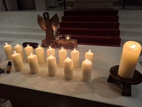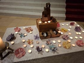 Während der Gedenkfeier wurden neben Texten wie 'Farben der Trauer' auch alle Namen der Verstorbenen vorgelesen. Für jeden Monat wurde im Gedenken an sie eine große Kerze angezündet sowie ihrer zum Ton der Klangschale in Stille gedacht. Zusätzlich bestand für die rund 50 Anwesenden die Möglichkeit, ein Teelicht für ein persönliches Gedenken anzuzünden. Das Flöten-Trio 'Pastorale' aus K-Dellbrück trug mit Instrumentalmusik zur angemessenen Atmosphäre bei und Pater Carlos, der selbst viel Erfahrung als ehrenamtlicher Sterbebegleiter hat, fand zum Abschluss tröstende Worte und spendete den Segen.