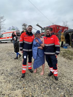 „Sobald die Wassertemperaturen einstellig werden, gehen wir jeden Sonntag baden“, berichtet Initiator René Hohnholz (oben rechts neben Nils Brandes, Leiter Wärmebusteam) und schwärmt von dem besonderen Glücksgefühl nach dem eisigen Badevergnügen. Auch Malteser Helfer Vincent Kroll traute sich erstmalig ins kalte Wasser. Seine Kollegen nahmen ihn anschließend mit einer Decke in Empfang. Er und 9 weitere Helferinnen und Helfer sind samstags in der kalten Jahreszeit regelmäßig mit dem Wärmebus in Lage und Detmold unterwegs.