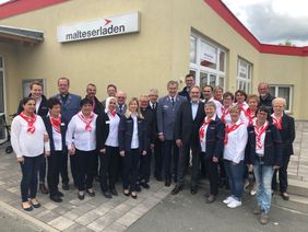 Gruppenfoto vor dem Malteserladen in Geseke, wo zahlreiche Ehrenamtliche dem Präsidenten einen großen Empfang bereitet haben.