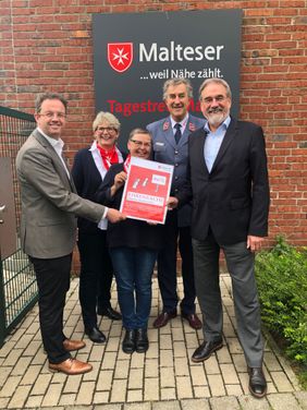Georg Khevenhüller (2.v.r.) mit (v.l.) Malteser Diözesangeschäftsführer Andreas Bierod, Elisabeth Wollschläger, Andrea Bentrup und Malteser Diözesanleiter Wolfgang Penning vor dem Tagestreff MalTa Hamm. Fotos: Frank Kaiser