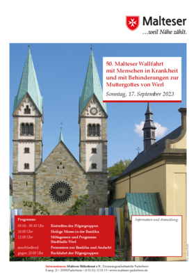 Der Malteser Hilfsdienst e.V. lädt alle Senioren und Menschen in Krankheit und mit Behinderungen am Sonntag, 17. September 2023, zur 50. Wallfahrt nach Werl ein. Das Pontifikalamt um 10 Uhr in der Wallfahrtsbasilika zelebriert Kurienbischof em. Josef Clemens.