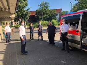 Begrüßung von Sophie von Preysing (r.) am Bereitstellungsraum am Berufsschulzentrum Rheda-Wiedenbrück durch Helfer der Gliederung Gütersloh: (v.l.) Volker Horenkamp, Christian Behr, Danilo Bartel, Marius Pahl und Thorsten Heß, Stadtbeauftragter.