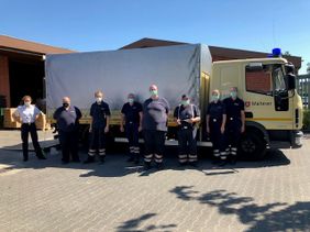 Sophie von Preysing (l.) mit Helferinnen und Helfern der Malteser aus Gütersloh, Paderborn und Büren, die bei der Kommissionierung und Auslieferung von Lebensmitteln und Hygieneartikeln aktiv sind. (Fotos: Anke Buttchereit)