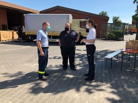 Sophie von Preysing und Thorsten Heß im Gespräch mit Tobias Johannhörster vom THW, das die Einsatzleitung Versorgung für die in Quarantäne befindlichen Menschen innehat, am zentralen Lager. Im Hintergrund wird ein Malteser LKW mit Lebensmittelkartons gepackt. Ziel für heute ist, 800 Kartons zu packen und zu verteilen.