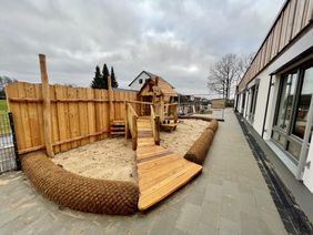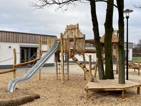 Kita-Leiterin Josefine Skusa-Henke freut sich, dass so vielfältige Spielmöglichkeiten gegeben sind: „Wir haben unterschiedliche Aufgänge, verschieden hohe Plattformen, mal überdacht, mal frei. Dazu unterschiedlich schwierige Kletterherausforderungen, an denen sich die Kinder mit ihren jeweiligen Fähigkeiten ausprobieren können.“ Neben der großzügigen Kletteranlage mit Rutsche ist noch eine Korbschaukel mit Platz für mehrere Kinder installiert worden. Im U3-Bereich wurde zusätzlich eine Kletterlandschaft geschaffen, die den Bedürfnissen der jüngeren Kinder angepasst wurde. Für das Frühjahr sind die Anpflanzungen geplant.