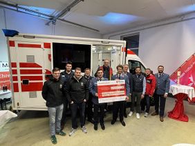 Vor dem neuen KTW B der Malteser Brakel (v. l.): Jannis Engel (Round Table), Marlon Rieger (Malteser und Inhaber NovuCare), Henrik Rathke (Round Table), Markus Gödde (ehrenamtlicher Geschäftsführer der Malteser Brakel), Oliver Baumann (Leiter Einsatzdienste Malteser), Monsignore Andreas Kurte, Ortsbeauftragter Caspar von Haxthausen, Dominik Reineke (VerbundVolksbank OWL eG, Brakel), Thomas Albers (Vereinigte Volksbank eG, Brakel), Jan Bastke (Bastke Foliendesign) und Martin Arndt (Malteser Fundraising). Insgesamt rund 4.500 Euro an Geld und Sachspenden kamen für die Malteser Brakel zusammen.