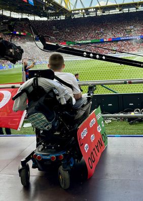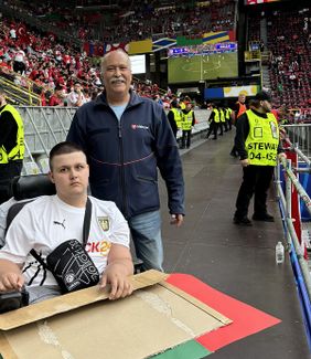 Aber auch im vergangenen Jahr, während Amin eine Online-Ausbildung von zuhause aus begann, riss der Kontakt zu seinem ehemaligen Fahrer nicht ab. So war es für Amins Mutter selbstverständlich, dass Bahri und seine Frau zu Amins 18. Geburtstag eingeladen wurden. Ein schönes Fest. Das beste Geschenk: Auf Grund einer Absage eines anderen Rollstuhlfahrers rückte Amin nach und durfte zum EM-Spiel Türkei vs. Portugal nach Dortmund kommen. Spontan sagte Bahri als Fahrer zu und organisierte mit Unterstützung der Malteser Dienststelle OWL das passende Fahrzeug. Gegen Mittag am 22. Juni ging es für die beiden los nach Dortmund. Am Austragungsort war für Zuschauer mit Rollstuhl alles perfekt vorbereitet: freie Durchfahrt zum stadionnahen Parkplatz, nette Ordner und aufmerksame Volunteers, die die beiden zu ihren Zuschauerplätzen brachten.