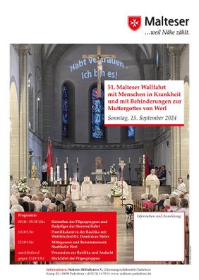Der Malteser Hilfsdienst e.V. lädt alle Senioren und Menschen in Krankheit und mit Behinderungen am Sonntag, 15. September 2024, zur 51. Wallfahrt nach Werl ein. Das Pontifikalamt um 10 Uhr in der Wallfahrtsbasilika zelebriert Msgr. Prof. Dr. Peter Schallenberg und wird musikalisch gestaltet durch den Madrigalchor Werl & den Neuer Chor Neheim.