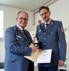 In Anerkennung und Würdigung herausragender Verdienste im Brand- oder Katastrophenschutz zeichnete Herbert Reul, Minister des Innern des Landes NRW, Ralf Schwemmer (l.) mit dem Brand- und Katastrophenschutz-Verdienst-Ehrenzeichen in Silber aus. Überreicht wurde die Auszeichnung im Auftrag des Ministers, verbunden mit dessen herzlichen Glückwünschen, von Tillman Castillo Romero, Leiter Notfallvorsorge der Malteser in der Erzdiözese Paderborn.