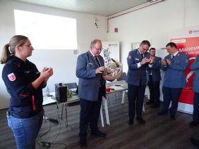 Ein Dankeschön der Helfer zum Abschied als Zugführer: Ralf Schwemmer erhielt für sein Engagement sowie für seine Art und respektvollen Umgang mit den Helfern viele persönliche Geschenke. (Fotos: Malteser Lippstadt)