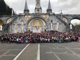 So wie hier im März 2018 wird sich auch im April 2019 wieder eine große Pilgergemeinschaft nach Lourdes aufmachen – und sich zum Gruppenfoto vor der Rosenkranzbasilika aufstellen.