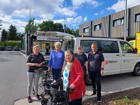 Die drei Seniorinnen mit ihren ehrenamtlichen Begleitern Hanna Großerode und Karsten Möller vom Mobilen Einkaufswagen-Team der Malteser.