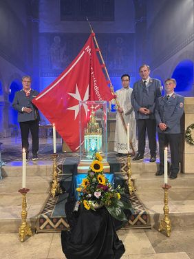 Mit dem Malteser Banner beim Reliquienschrein (v. l.): Regina Franz, Ortsbeauftragte der Malteser in Büren, Pastor Duc Thien Nguyen, Frank Rademacher und Valentin Brüne, ebenfalls Malteser Büren. (Foto: Malteser Büren)