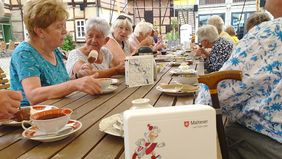 Sommerfest im Regen? Für die Seniorinnen und Senioren aus Ballenstedt kein Problem. Eis am Stiel, Grillwürstchen, süße Melone, Bowle und Kaffee schmecken trotzdem - das Zeltdach im alten Gutshof Ziegenhagen hält schließlich trocken genug. Denn was für die Männer und Frauen vor allem zählt: miteinander ins Gespräch kommen, die neustens in Entwicklungen im kleinen Harzstädtchen besprechen und im Rahmen des Seniorencafés die Zeit miteinander genießen.