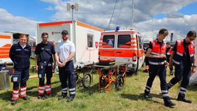 Mittendrin im Festivaltrubel steht unter wolkig-blauem Himmel eine kleine Sanitätsstadt: die Unfallhilfsstelle (UHS). Fahrzeug reiht sich an Fahrzeug, Aufenthaltscontainer und Hilfsmittel. In einer Ecke steht ein Stromaggregat, direkt daneben der neue Tankanhänger. Seit wenigen Wochen in der Diözese Magdeburg stationiert, ist es der erste Einsatz für den Anhänger. Daneben stehen mobile Feldtragen. "Die sind organisiert worden, wo es möglich war. So können unsere sechs Fußtruppen bei Bedarf Menschen leichter im unebenen Gelände transportieren", erklärt Andre Podschun.