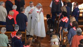 Grund genug für die Malteser, dieses Jubiläum im Rahmen eines Gottesdienstes zu feiern. Und so bevölkerten rund 40 Hunde mit ihren Herrchen und Frauchen am 1. September die Hadamarer Stadtkirche St. Johannes Nepomuk, um sich von Pfarrer Andreas Fuchs, Kreisseelsorger der Malteser für ihren Dienst segnen zu lassen und den Tönen der Veeh-Harfengruppe sowie Hilmar Schmidts bewegendem Sologesangsvortrag von Rolf Løvlands „You raise me up“ zu lauschen.