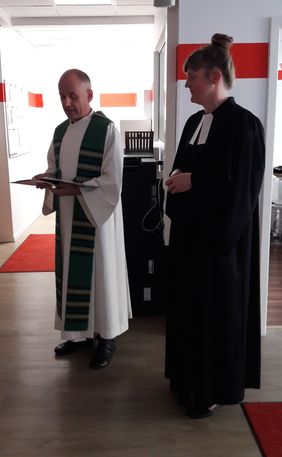 Den Segen spendeten Pfarrer Wolf und Vikarin in einer kleinen Andacht für die Dienststelle und für alle, die in den umgebauten Räumen arbeiten und sich dort begegnen. In den Räumen der Dienststelle solle gelebt und der Glaube an Gott bezeugt werden. Bedürftige sollen Hilfe erfahren und der Dienst am Nächste, könne nur mit Gottes Hilfe in die Gesellschaft hineinwirken, so die Vikarin während der Andacht.