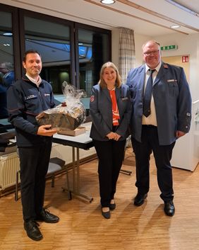 Anschließend wurde den aus Papenburg angereisten Kollegen Jens Kötter (Leiter Einsatzdienste Emsland/Grafschaft Bentheim) und Robert Pasker (Stellvertreter) ein Präsentkorb überreicht als Dank für ihre Bemühungen, die Malteser Lingen in den Katastrophenschutz einzubinden