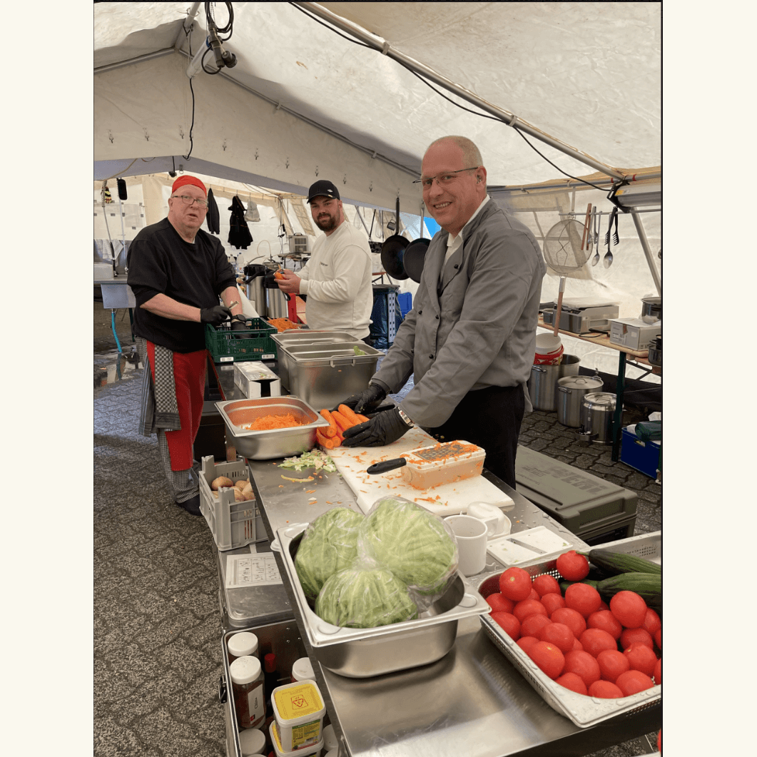 Mit insgesamt sechs Helfern – drei durchgehend, drei zusätzlich am Samstag – war Lippstadt bei Regen, Wind und Matsch jeden Tag an der Feuerlinie. Kochen unter Planen, dampfende Gaskocher, Schneidbretter im Dauerbetrieb – und mittendrin Menschen, die trotz aller Mühen nie den Überblick oder den Humor verloren.