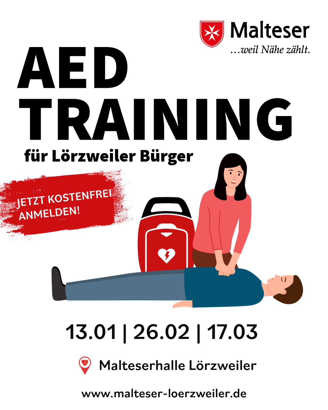 Automatische Externe Defibrillatoren (AED) können Leben retten – und sie sind so konzipiert, dass sie im Notfall von jedem, auch von Laien, einfach und schnell angewendet werden können. Damit im Ernstfall jeder sicher handeln kann, bieten die Malteser Lörzweiler ein spezielles Training für die im Ort vorhandenen Geräte an. Die Gemeinde Lörzweiler übernimmt die Kosten für diese Veranstaltung, sodass die Teilnahme für alle Lörzweiler Bürgerinnen und Bürger kostenfrei ist.