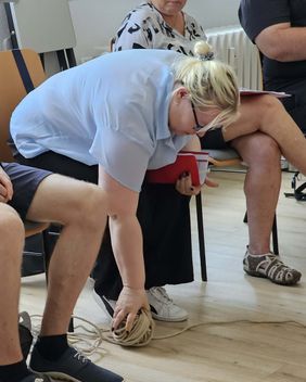 Das Knäuel wandert von Stuhl zu Stuhl, wird um Stuhlbeine gewickelt. Mit jeder Person, die spricht, wird das symbolische Netz dichter. Und mit jeder Stimme wird klarer, warum die Menschen im Raum hier richtig sind.