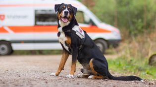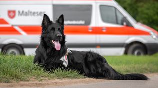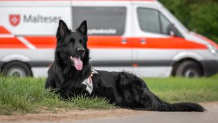 Über Yari: Steht dieser große, schwarze Hund beim Auffinden vor einer Person und bellt ohne Unterbrechung, will er nur eins – sein Spielzeug. Yari zeigt so seiner Hundeführerin, wo sich die Person im Gelände befindet.