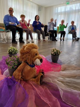 Zunächst machten wir uns mit Hertha auf zu einem Spaziergang. Wir pflückten im Anschluss Rosen und machten einen schönen bunten Strauß daraus. Neben dem Sportpalastwalzer bewegten wir uns auch zu amerikanischen Klängen und zum Klassiker „Butterfly“ von Danyel Gérard. Bei einer Samba im Sitzen konnten die Teilnehmerinnen und Teilnehmer sodann Rhythmus im Blut beweisen. Zum Abschluss hatte Löwe Leo nochmal mit „The Lion Sleeps Tonight“ seinen Auftritt.