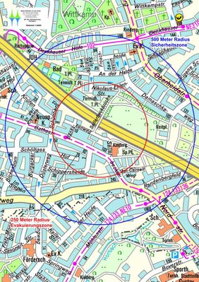 Im Umkreis von 250 Metern wurde eine Evakuierung erforderlich. Etwa 669 Personen waren davon betroffen. Im 500 Meter Bereich sollten Bewohner sich luftschutzmäßig verhalten.
