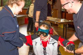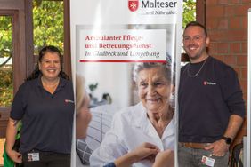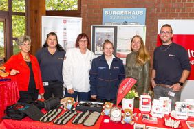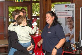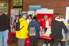 Hier präsentierten wir uns mit hauptamtlichen Angeboten wie Menüservice, Hausnotruf und natürlich unserem Pflegedienst für Gladbeck und Umgebung. Ehrenamtliche Helfer informierten beispielsweise zum Miteinander-Füreinander-Projekt, dem Herzenswunsch-Krankenwagen und zu unserem umfangreichen Ausbildungsangebot. Als "Eyecatcher" erwies sich hier unser Alterssimulationsanzug, den wir in der sozialpflegerischen Ausbildung einsetzen. Künftige Pflege- und Betreuungskräfte können sich nach dieser Erfahrung besser in die alten und gebrechlichen Menschen hineinversetzen, die ihnen anvertraut werden, indem sie typische Altersgebrechen und Einschränkungen am eigenen Körper "erleben". Unsere Bürgermeisterin Bettina Weist ließ sich beim Besuch an unserem Stand gerne auch selbst "altern" und bekam einen Eindruck davon, wie sich beispielsweise ein alter Mensch an der Supermarktkasse fühlt, wenn mit der unruhigen Schlange im Rücken das Kleingeld in der Geldbörse gesucht wird.