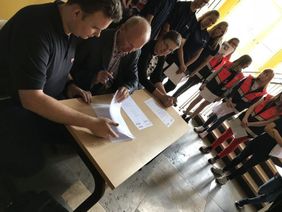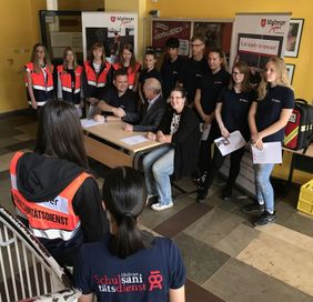 "Euch habe ich schon mehrmals im Einsatz gesehen" berichtet Schulleiter Berthold Kuhl voller Stolz bei der offiziellen Unterzeichnung des Kooperationsvertrages. Seit knapp einem halben Jahr sorgen die engagierten Schulsanitäterinnen und -sanitäter an der Frida-Levy-Gesamtschule für die Erstversorung verletzter oder erkrankter Personen. Bereits bei über 50 Einsätzen von Übelkeit über Prellungen bis hin zum Verdacht auf einen Bruch zeigten sie ihr Können. "Es macht richtig Spaß zu helfen," berichtet Aylin, "die Arbeit im Team läuft super." Schulsani-Kollege Darjusch ergänzt: "Es ist sehr abwechslungsreich, durch unsere Ausbildung sind wir gut vorbereitet. Bislang gab es in meinem Team keine Situation, in der wir nicht wussten, was zu tun ist." Zwei Drittel der neuen Schulsanis verfügen bereits über die große Malteser-Schulsanitätsdienst-Ausbildung, die für die Schülerinnen und Schüler freiwillig an sieben Tagen am Wochenende stattgefunden hat. "Mich hat beeindruckt, wie souverän die Schulsanis bei der Prüfungssimulation gehandelt haben und wie viel Freude am Helfen erkennbar ist." sagt Sebastian Smitmans, Leiter Schulsanitätsdienst der Essener Malteser. Als Betreuungslehrerin hält Ivonne Wallmann die Gruppe zusammen: "Das Engagement von allen Beteiligten ist überragend, klassenübergreifende Zusammenarbeit gestalten sie hervorragend."