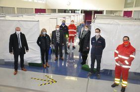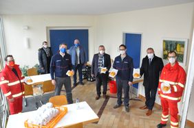 Würzburg. Am Silvestermorgen kamen Landrat Thomas Eberth und Manfred Ländner, MdL, in Begleitung von Eva-Maria Löffler, Marieke Wildenauer-van Santen und Paul Justice vom Testmanagement des Landkreis Würzburg ins Corona-Testzentrum in der Franz-Oberthür-Schule, um den Mitarbeitenden und den Verantwortlichen der DLRG Ortsgruppen Gerbrunn und Würzburg sowie der Malteser Würzburg ihren Dank auszusprechen. Seit dem 18. Dezember betreiben die beiden Hilfsorganisationen im Auftrag des Landkreises die Abstrichzentren in Ochsenfurt und Bergtheim und hatten nach Weihnachten auch den Betrieb des Testzentrums in der Franz-Oberthür-Schule von BRK und JUH übernommen. Der Besuch hatte für die Einsatzkräfte gebackene Glücksschweine dabei, die - so Landrat Eberth - für 2021 „wenig Corona, dafür aber umso mehr Glück, Gesundheit und Fröhlichkeit bringen sollen“. Thomas Eberth erklärte, welch hohe Akzeptanz die Testzentren in der Bevölkerung genießen und lobte die professionelle Abwicklung vor Ort durch die Hilfsorganisationen. Das Lob gaben die Einsatzleiter Christoph Graf-Hadry und Tobias Elswick von der DLRG und Johannes Albert von den Maltesern an das Landratsamt weiter, denn die Zusammenarbeit insbesondere mit dem Testmanagement „war zu jederzeit reibungslos, sehr kollegial und unkompliziert“, so die Einsatzleiter.