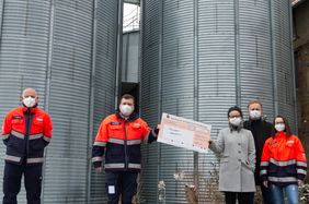 „Wir sind einfach nur begeistert – und unheimlich dankbar“, der Malteser Ortsbeauftragte Christian Margraf (2.v.l.) und sein Stellvertreter Holger Biegner (1.v.l.) sind fast sprachlos, als ihnen Familie Hußlein in Waldsachsen einen Spendenscheck in Höhe von 1000 Euro für ihre geplante neue Unterkunft der Malteser Abersfeld übergibt. Bettina und Matthias Hußlein (3.u.2.v.r.) betreiben in Waldsachsen Landwirtschaft und sind den Maltesern schon lange verbunden. Tochter Carina (rechts) engagiert sich seit Jah-ren im benachbarten Malteser Ortsverband Grafenrheinfeld. Über die Sozialen Medien, die Zeitung und ihre Tochter hatten Hußleins von dem Spendenaufruf der Abersfelder Malteser für ihre neue Unterkunft erfahren und haben sich schnell entschieden, für dieses Projekt zu spenden. „Die Ehrenamtlichen machen doch eine gute und wichtige Arbeit in der Großgemeinde“, ist Matthias Hußlein überzeugt. „Wir machen unsere Spende vor al-lem deshalb öffentlich, damit auch andere Betriebe aus der Region den Abersfelder Malte-sern etwas spenden“, so der Landwirt weiter.