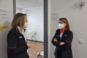 Aschaffenburg/Hösbach. Die ehrenamtliche Vizepräsidentin des Malteser Hilfsdienstes Deutschland Clementine Perlitt war am vergangenen Donnerstag zu Besuch im Impfzentrum in Hösbach und zeigte sich beeindruckt von der Leistung der über 130 Malteser Mitarbeiterinnen und Mitarbeiter, die täglich dort ihren Dienst tun. „Sie sind ein grandioses Team, und das liegt an jedem einzelnen von Ihnen. Hut ab vor Ihrem Engagement“, sagte sie am Ende ihres gut zweistündigen Besuches. Die Leiterinnen des Impfzentrums Anja Brückner und Yvonne Nebel sowie der Malteser Bezirksgeschäftsführer Rainer Kaufmann hatten die Vizepräsidentin durch das Impfzentrum geführt und ihr vom enormen Arbeitsaufwand sowie von der geforderten hohen Flexibilität im Alltag berichtet. „Die Zusammenarbeit mit dem Landratsamt und dem leitenden Arzt ist wunderbar“, betonten die beiden, was auch die Stimmung im Impfzentrum positiv beeinflusse. Da zahle sich die gute Vernetzung aus, die bereits vor der Pandemie mit den Behörden bestanden habe. Das bestätigte auch Frank Wissel vom Landratsamt Aschaffenburg und der Ärztliche Leiter Dr. Jürgen Luxem: „Wir sind sehr froh, dass gerade die Malteser den Job hier machen!“ Clementine Perlitt lobte diese Netzwerkarbeit im Vorfeld: „Das Impfzentrum Aschaffenburg ist ein gutes Beispiel dafür, dass, wenn man lösungsorientiert arbeitet, sich persönlich einbringt und einander wertschätzend begegnet, immer etwas Gutes bei rauskommt, auch wenn die Lage schwierig ist.“ In Aschaffenburg wehe ein Malteser Geist im besten Sinne, so die Malteser Vizepräsidentin. Sie bedankte sich für alle Anstrengungen und bat die Malteser Aschaffenburg: „Erhalten Sie sich Ihren Humor und Ihre Einsatzfreude.