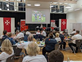 Diözesanleiter Dr. Johann Rotger van Lengerich begrüßte die Teilnehmenden und beglückwünschte zunächst die neu gewählte Diözesanjugendsprecherin Jasmin Sanders aus der Gliederung Bockhorst-Rhauderfehn zu ihrer Wahl. In dem Tätigkeitsbericht zu den Jahren 2021 und 2022 blickte Dr. van Lengerich auf eine bewegte Zeit in der Diözese zurück. Die Malteser standen in den beiden Corona-Jahren vor großen Herausforderungen wie dem Aufbau von Impfzentren, das Umdenken in den Diensten, die nicht mehr in Präsenz stattfinden konnten und die Umgestaltung der Führungsebene auf Ortsebene hin zu Ortsvorständen. „Die zahlreichen und vielfältigen Aufgaben eines Ortsbeauftragten können in der heutigen Zeit nicht mehr nur auf den Schultern einer Person lasten. Suchen Sie sich Unterstützung für die Führung Ihrer Ortsgliederungen, um sich für die Zukunft aufzustellen,“ gibt Dr. van Lengerich zu bedenken.