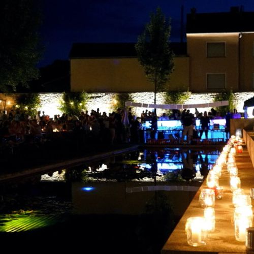 Für das leibliche Wohl ist gesorgt, ob mit Waffeln, Gegrilltem oder einem Cocktail am Abend. Nach dem Sonnenuntergang schaffen viele Kerzen und Lichter eine gemütliche Stimmung.