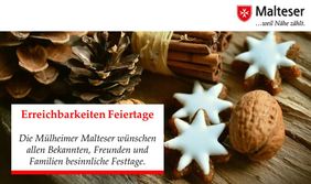 Das Büro der Mülheimer Malteser bleibt über die Feiertage geschlossen. In dringenden Fällen ist unser Bereitschaftsdienst unter der Rufnummer 0208 / 207 944 20 zu erreichen.