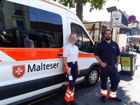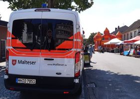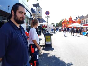 Hier wird mit einem Krankenwagen und Hilfskräften das Straßenfest, veranstaltet durch die IGS Speldorf, sanitätsdienstlich begleitet.
