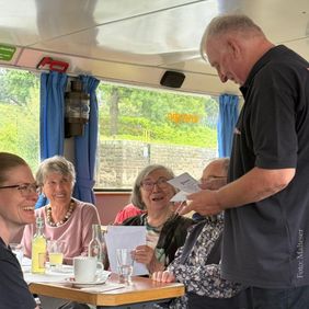 Im gemütlichen Tempo ging es dann mit “Friedrich Freye” Richtung Kettwig und wieder zurück. An Bord wurden die Teilnehmenden mit Kaffee und Kuchen sowie einem kalten Getränk verwöhnt.