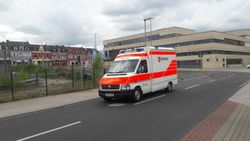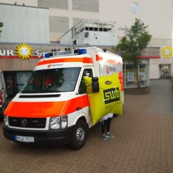 Aktuell sind Hilfskräfte der Mülheimer Malteser zu Gast in Gelsenkirchen. Hier wird ein Rettungswagen im Start- und Zielbereich des Vivawest-Marathons bereitgestellt.