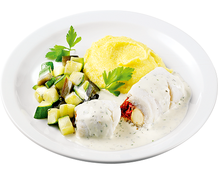 mit Tomaten-Mozzarellafüllung, in Sahnesoße mit Zucchini und Auberginen verfeinert, dazu cremige Maispolenta