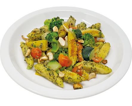 mit Cherrytomaten, Zucchini, Broccoli und Karotten in feinem Basilikumpesto mit geriebenem Hartkäse und Cashewkernen