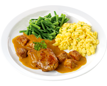 Hähnchenmedaillons und Schweinelende in feiner Rahmbratensoße, grüne Bohnen und Knöpfle-Spätzle