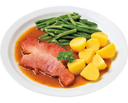 Festliche Schweineschulter gepökelt, in herzhafter Bratensoße mit Prinzessbohnen und Salzkartoffeln