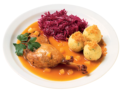 Weihnachtliche Entenkeule in Bratapfelsoße an Apfel-Blaukraut und gekochte Kartoffelknödel
