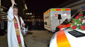 Im Anschluss fand im Hof eine feierliche Segnung des Anhängers, des Mannschaftstransportwagens sowie eines Krankentransportwagens aus dem Rettungsdienst und eines Gerätewagens Sanität aus Mitteln des Landes Bayern statt. Stadtpfarrer und Malteser Seelsorger Andreas Maria Zach erbat den Segen für die Fahrzeuge und alle Helfer, die damit in Zukunft Menschen in Not zu Hilfe eilen werden.